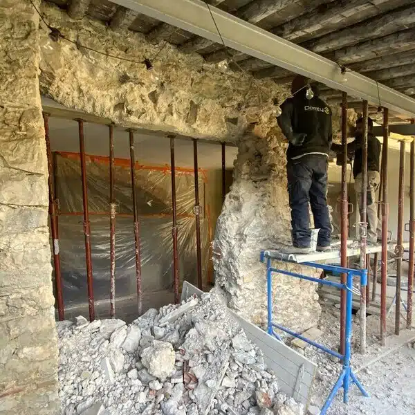 L’étape la plus délicate : l’ouverture. Elle se fait avec des outils adaptés à la maçonnerie en pierre pour préserver la structure environnante. Chaque pierre est retirée avec soin, en suivant un plan méthodique. Cette précision est essentielle pour éviter tout affaiblissement des murs adjacents.